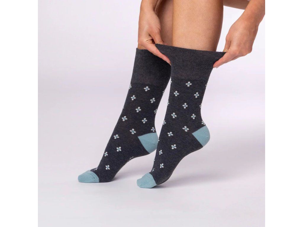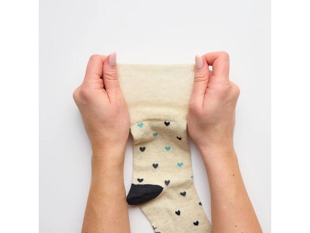Dámske ponožky so širokým, nesťahujúcim lemom a voľnou konštrukciou po celej dĺžke. Kopírujú prirodzený tvar a krivky vašich nôh, netlačia a nezarezávajú sa do pokožky. Majú ploché švy na špičke prstov spájané retiazkovou metódou bez zošitia. Sú vyrobené z jemnej bavlny príjemnej na dotyk, poskytujúcej sviežosť, sucho a pohodlie pre vaše nohy. Vhodné pre ľudí so slabým prekrvením nôh, hrubšími alebo opuchnutými nohami a diabetikov. Ponožky majú spevnenú pätu a špičku.