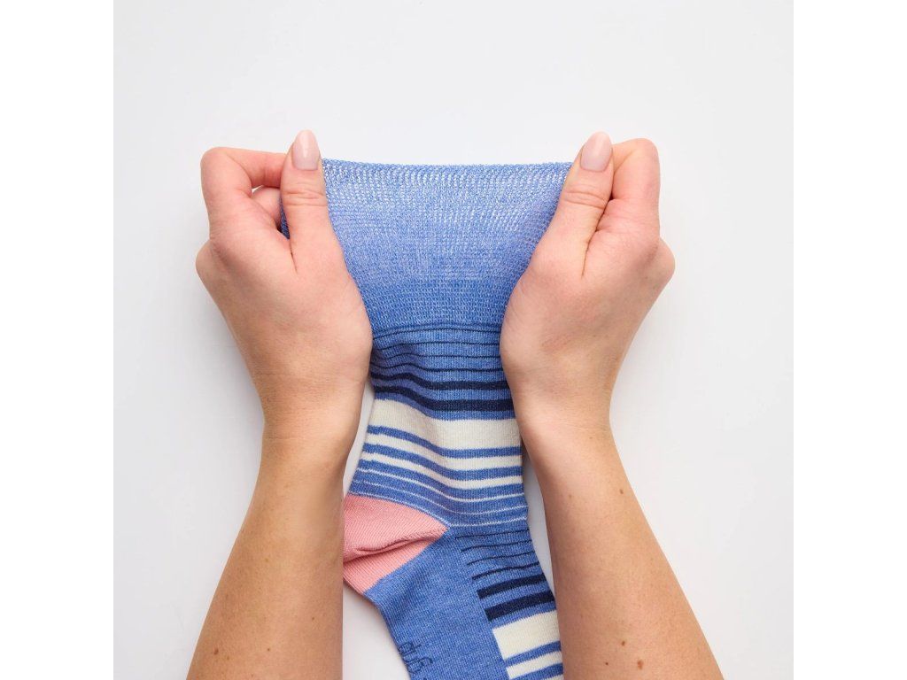 Dámske ponožky so širokým, nesťahujúcim lemom a voľnou konštrukciou po celej dĺžke. Kopírujú prirodzený tvar a krivky vašich nôh, netlačia a nezarezávajú sa do pokožky. Majú ploché švy na špičke prstov spájané retiazkovou metódou bez zošitia. Sú vyrobené z jemnej bavlny príjemnej na dotyk, poskytujúcej sviežosť, sucho a pohodlie pre vaše nohy. Vhodné pre ľudí so slabým prekrvením nôh, hrubšími alebo opuchnutými nohami a diabetikov. Ponožky majú spevnenú pätu a špičku.