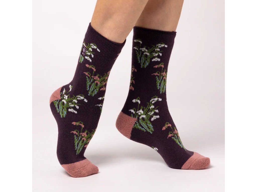Tieto ponožky zobrazujú biele a ružové snežienky na fialovej ponožke s kontrastnou pätou a špičkou. S pôsobivým hodnotením *TOG 1,60 sú tieto ponožky Lite až štyrikrát teplejšie ako bežné bavlnené ponožky. Poskytujú vám ideálnu rovnováhu medzi hrúbkou a teplom, vďaka čomu si môžete dlhodobo užívať pohodlie vo vašej ležérnej obuvi po celý rok.
