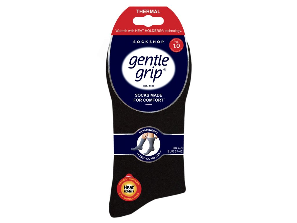 Dámske teplé termo ponožky Gentle Grip s technológiou Heat Holders sú prvou voľbou pre ľudí, ktorým bežné ponožky nevyhovujú tlačia a sťahujú nohu, dobre priliehajú a sú nepohodlné. S hodnotou 1,0 *TOG sú tieto termo ponožky trikrát teplejšie ako bežné bavlnené ponožky a aj s ich menším objemom poskytujú tepelnú ochranu. Technológia Heat Holders s vyčesanou vnútornou stranou udržuje viac teplého vzduchu v blízkosti pokožky a pridáva na mäkkosti.