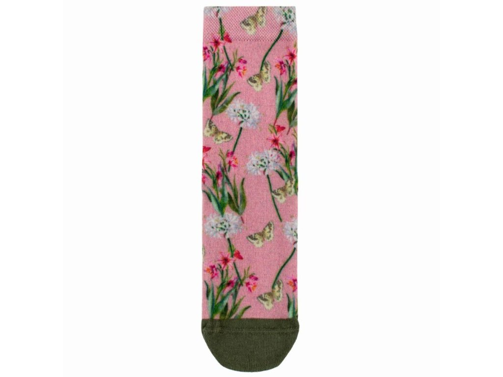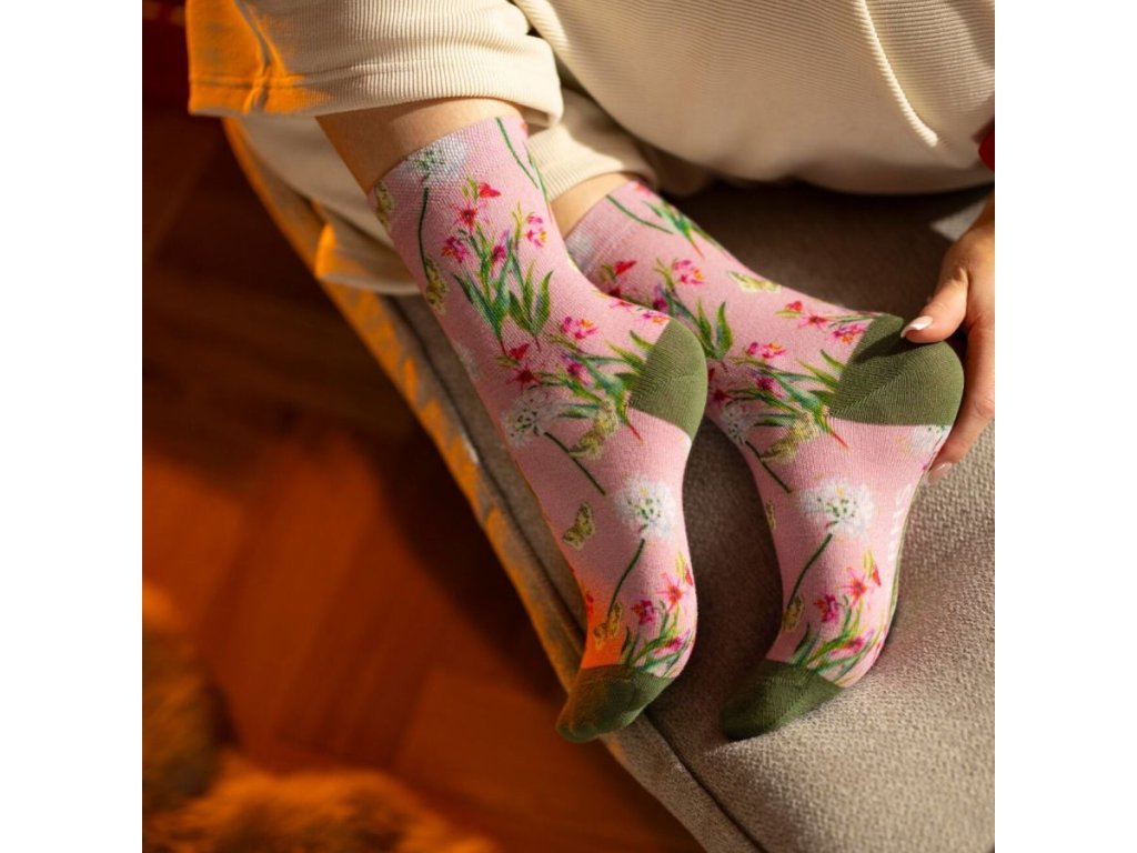 - dizajn: ružové ponožky zdobia kvietky, púpavy a motýle, kontrastná päta a špička v zelenej farbe