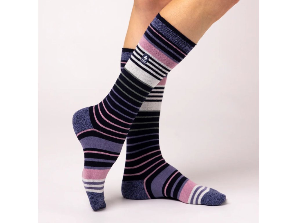 Dámske Heat Holders lyžiarske športové podkolienky Outdoor v tenšej hrúbke Ultra LITE Fialovo Modré s farebnými prúžkami sú navrhnuté tak, aby pohodlne zapadli do lyžiarskych topánok - lyžiarok. Sú ideálne na aktívne lyžovanie, snowboarding či iné zimné športy alebo zábavu v snehu a sú maximálne pohodlné, keď budete neskôr relaxovať po aktívnom dni. Elastická klenba a podpery členkov dokonale padnú a pomáhajú predchádzať zhlukovaniu ponožiek vo vnútri topánok. S úžasným hodnotením *TOG 1,0 sú trikrát teplejšie ako bežné bavlnené ponožky, takže získate viac tepelnej ochrany s menšou hrúbkou ponožky.