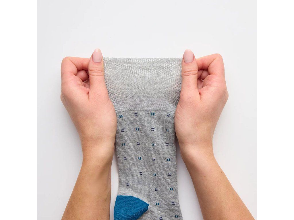 Pánske štýlové ponožky Gentle Grip so širokým, nesťahujúcim lemom a voľnou konštrukciou po celej dĺžke. Kopírujú prirodzený tvar a krivky vašich nôh, netlačia a nezarezávajú sa do pokožky. Majú ploché švy na špičke prstov spájané retiazkovou metódou bez zošitia. Sú vyrobené z jemnej bavlny príjemnej na dotyk, poskytujúcej sviežosť, sucho a pohodlie pre vaše nohy. Vhodné pre ľudí so slabým prekrvením nôh, hrubšími alebo opuchnutými nohami a diabetikov.