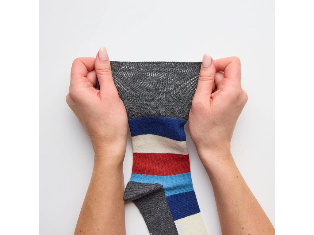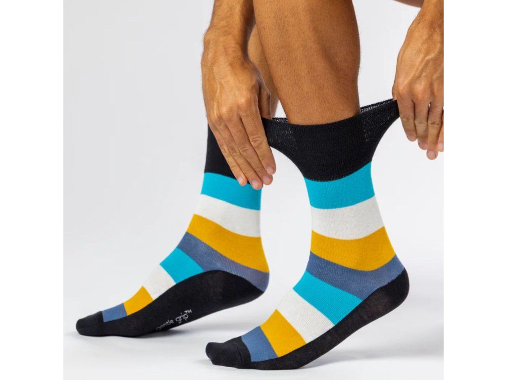 Pánske štýlové ponožky Gentle Grip so širokým, nesťahujúcim lemom a voľnou konštrukciou po celej dĺžke. Kopírujú prirodzený tvar a krivky vašich nôh, netlačia a nezarezávajú sa do pokožky. Majú ploché švy na špičke prstov spájané retiazkovou metódou bez zošitia. Sú vyrobené z jemnej bavlny príjemnej na dotyk, poskytujúcej sviežosť, sucho a pohodlie pre vaše nohy. Vhodné pre ľudí so slabým prekrvením nôh, hrubšími alebo opuchnutými nohami a diabetikov.