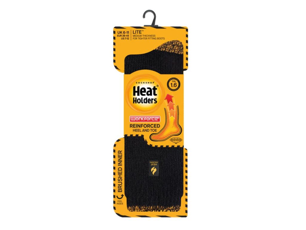 Stredne rubé teplé pracovné ponožky Heat Holders® LITE vo verzii WORKFORCE s odolnou zosilnenou pätou a špičkou pre lepší výkon a dlhšiu trvácnosť vo väčšom pracovnom zaťažení, sú vyrobené zo špeciálne vyvinutej objemovej priadze, s výborbnými tepelnými vlastnosťami. Vďaka dlhému froté úpletu tieto ponožky pomôžu udržať chodidlá v teple a úplnom pohodlí. Každá ponožka je z vnútornej strany vyčesaná, čím je senzačne mäkká a zachytáva oveľa väčšie množstvo teplého vzduchu v blízkosti pokožky. Takto ponožky lepšie a dlhšie chránia chodidlá počas najchladnejších dní.