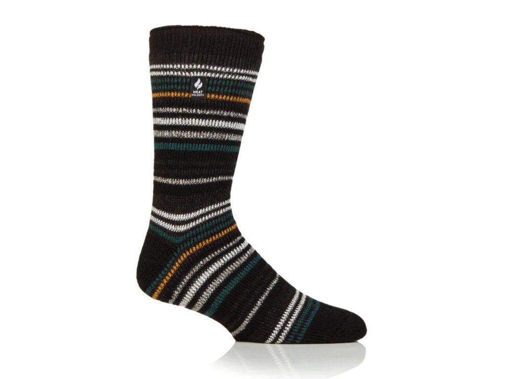 Pánske originálne hrubé ponožky Heat Holders Astana v čiernej farbe s farebnými úzkymi prúžkami vo vzore určite udržia vaše nohy v teple aj v tých najchladnejších dňoch a dokonca aj v mrazivom počasí. Ponožky s pokročilou termo priadzou navrhnutou v Japonsku, dlhými slučkami froté úpletu, ktorý je PATENTOVANÝ vo Veľkej Británii a odborným procesom intenzívneho vyčesania vnútra ponožky, ktorý udrží viac teplého vzduchu v blízkosti vašej pokožky, aby boli ponožky super mäkké a extra teplé, takže vaše nohy sú zostávajú dlhšie v teple, chránené a izolované proti zime. Original hrubé ponožky majú maximálnu dĺžku slučky s hodnotením *TOG 2,34.