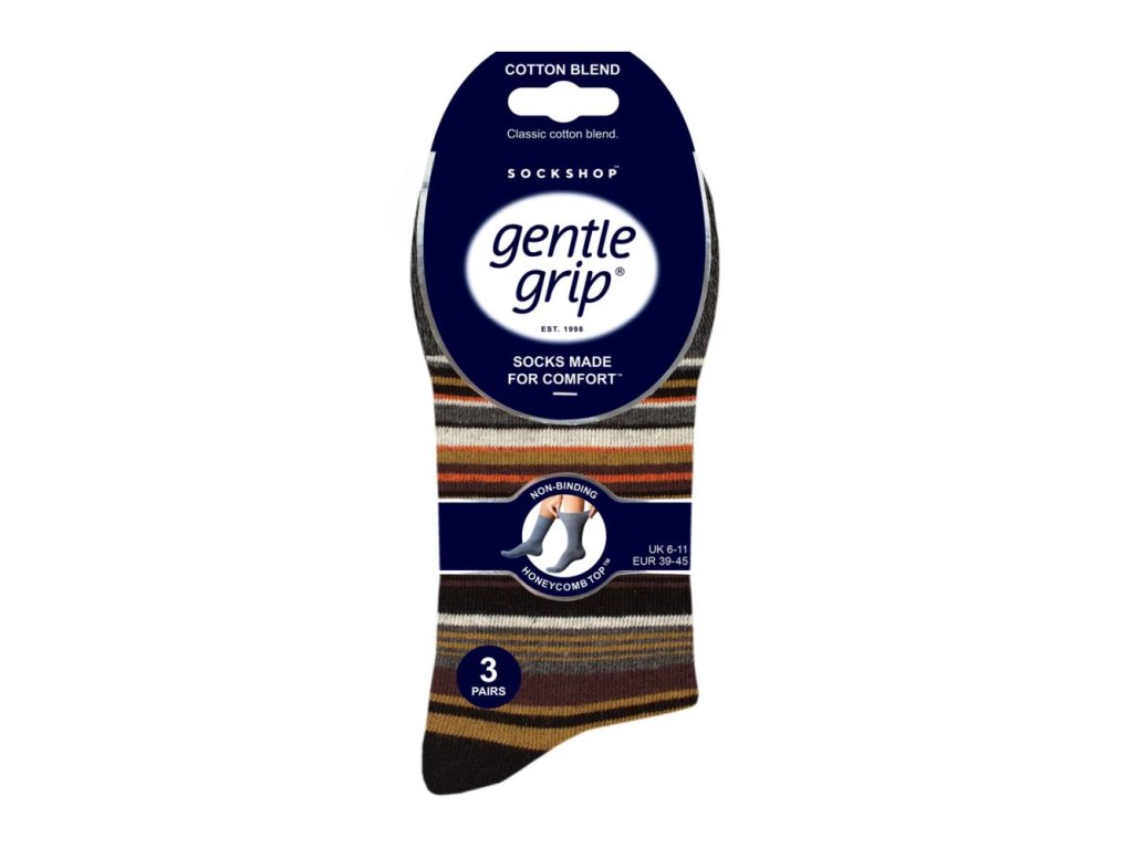 Pánske Gentle Grip ponožky so širokým, nesťahujúcim lemom a voľnou konštrukciou po celej dĺžke. Kopírujú prirodzený tvar a krivky vašich nôh, netlačia a nezarezávajú sa do pokožky. Majú ploché švy na špičke prstov spájané retiazkovou metódou bez zošitia. Sú vyrobené z jemnej bavlny príjemnej na dotyk, poskytujúcej sviežosť, sucho a pohodlie pre vaše nohy. Vhodné pre ľudí so slabým prekrvením nôh, hrubšími alebo opuchnutými nohami a diabetikov. Ponožky majú spevnenú pätu a špičku.