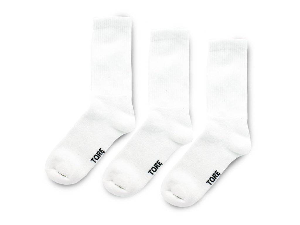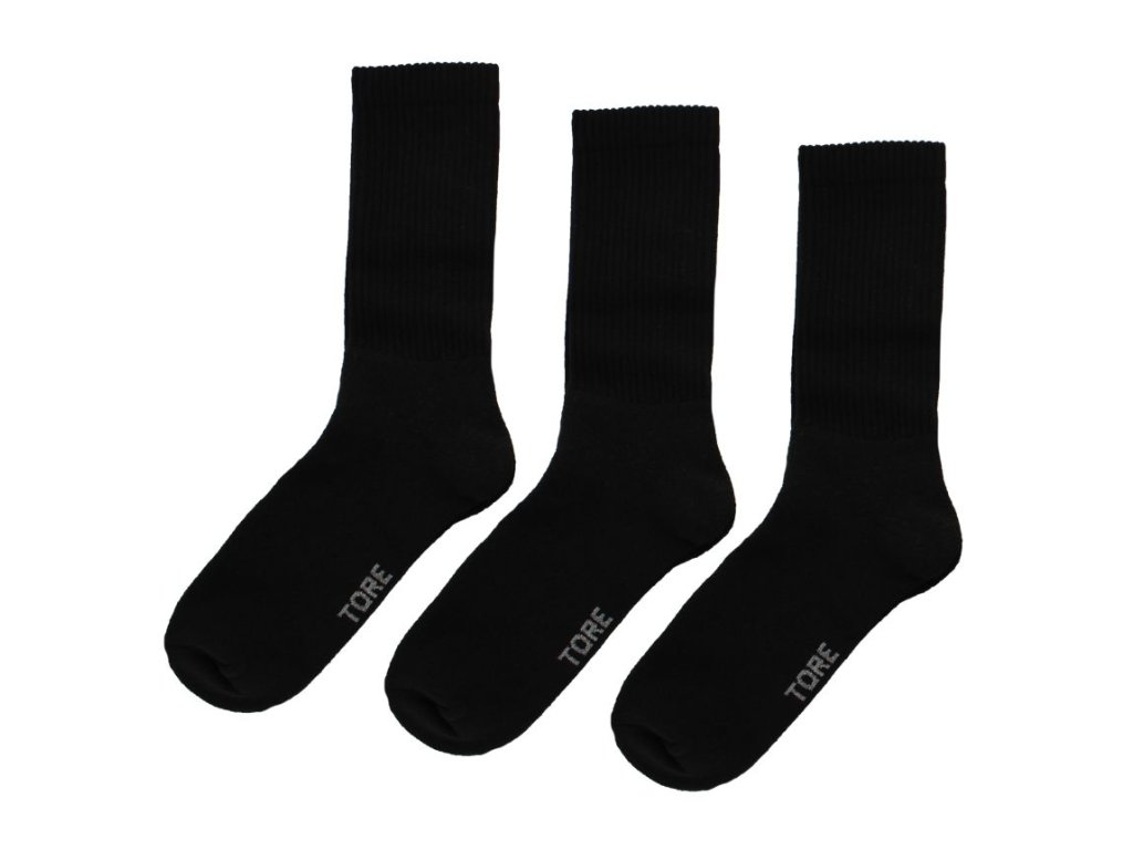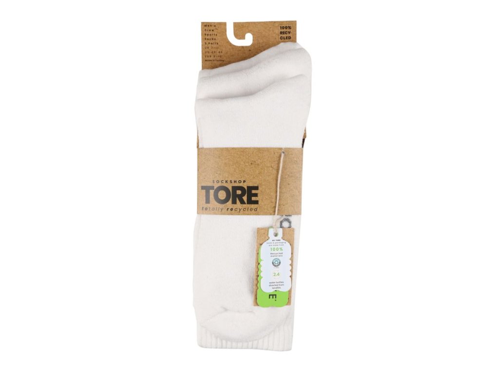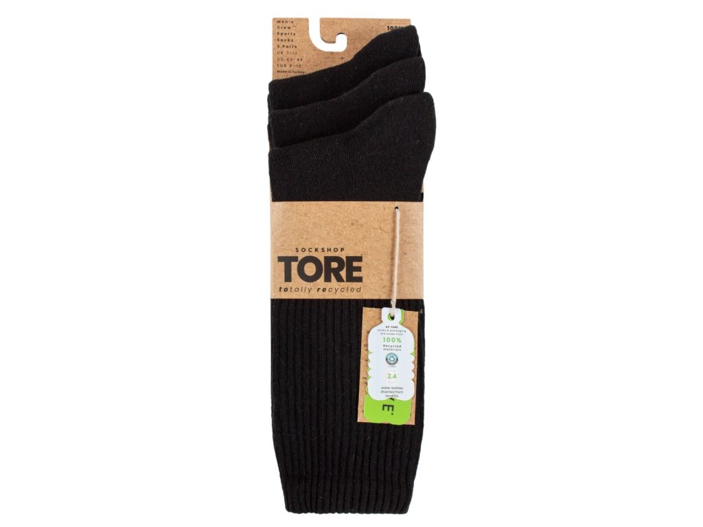 Športové pánske ponožky TORE sú vyrobené zo 100% recyklovaných materiálov ako je bavlnený odpad a umelé fľaše, dokonca aj obaly sú recyklované. Jedno takéto 3-párové balenie ponožiek ušetrí až 2 roky pitnej vody, odkloní 2,4 PET fliaš a 0,6 trička zo skládok. Ponožky majú štandardné šité švy na špičke a klasický športový rebrovaný lem.