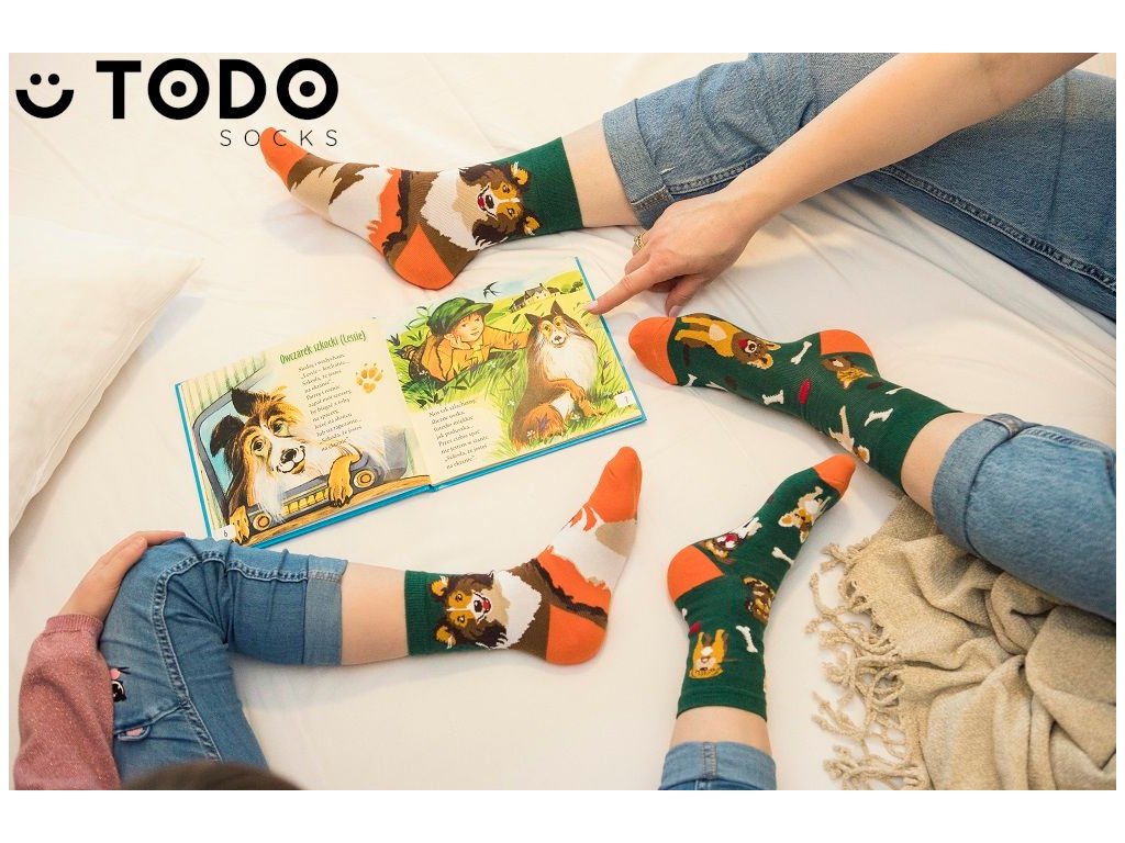 Veselé, farebné ponožky značky TODO SOCKS - model Dogs - Psíky, roztomilé malé aj väčšie psíky plné radosti zo života v očiach strážia každý Tvoj krok.